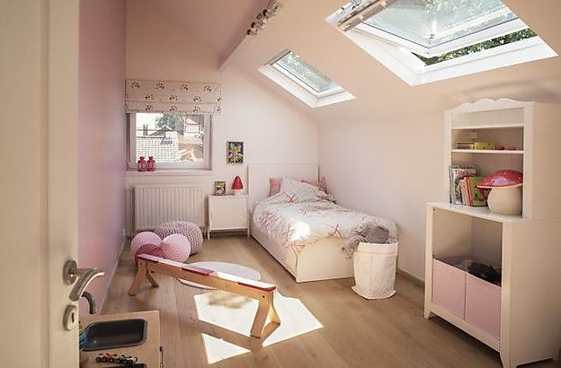 Vervolgens was de kamer van dochter Victoria aan de beurt. Een klein verticaal raampje bood er veel te weinig licht. “Uiteindelijk hebben we twee grote dakvensters naast elkaar geplaatst, voor meer licht en een aangenamer gevoel in de kamer”, vertellen de ouders. Tot slot werd ook de traphal aangepakt. Daar was geen enkel raam, en tot op het gelijkvloers was er dus ook amper lichtinval. Bovenaan de trap werden twee nieuwe Velux dakvensters geïnstalleerd, de hoge plaatsing ervan zorgt voor een schoorsteeneffect. Aangezien warme lucht stijgt, is er nu een goede ventilatie in de traphal.